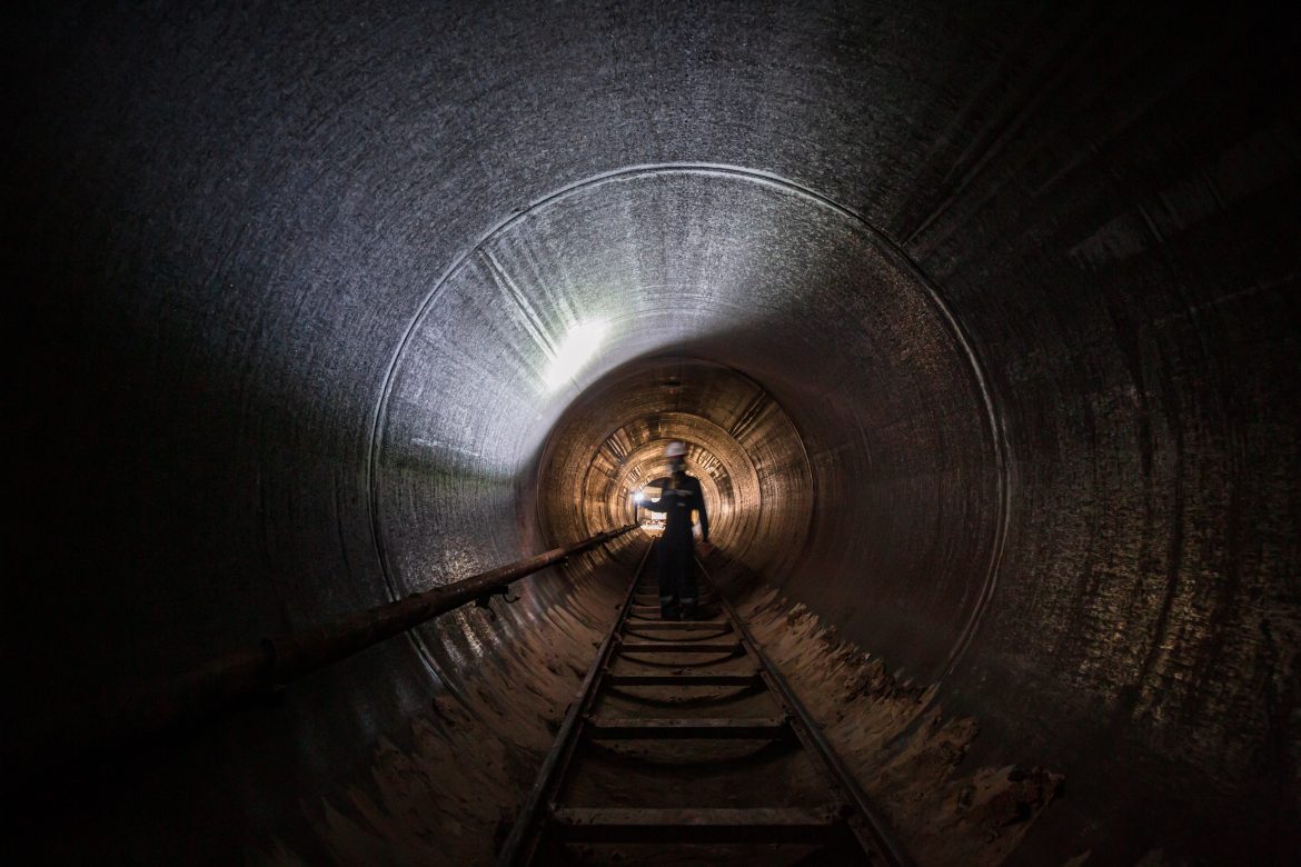 Working male inspection weld underground of equipment tunnel By using the flashlight.